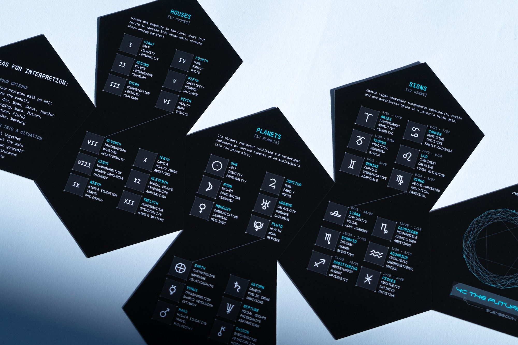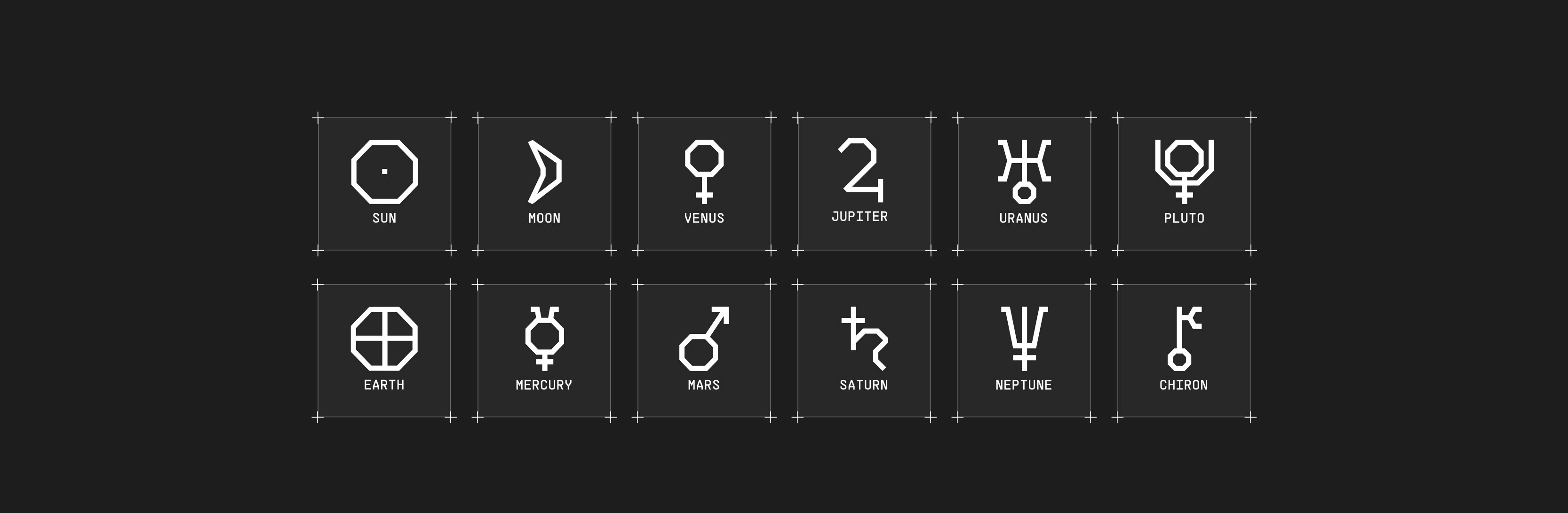 Our brand guideline begins from the goal to package astrology in a modern way, bridging the gap between traditional method and modern science. The black and white not only represent the darkness and light, but also beginnings and endings. Red and blue stem from that. Orange signifies the sun as source for wisdom, rather than inside. The bright blue color of the sky represents bright future of the user after they start using the kit. Mono typeface and the symbols are used through out as they are modular, aligning with our brand attributes.
