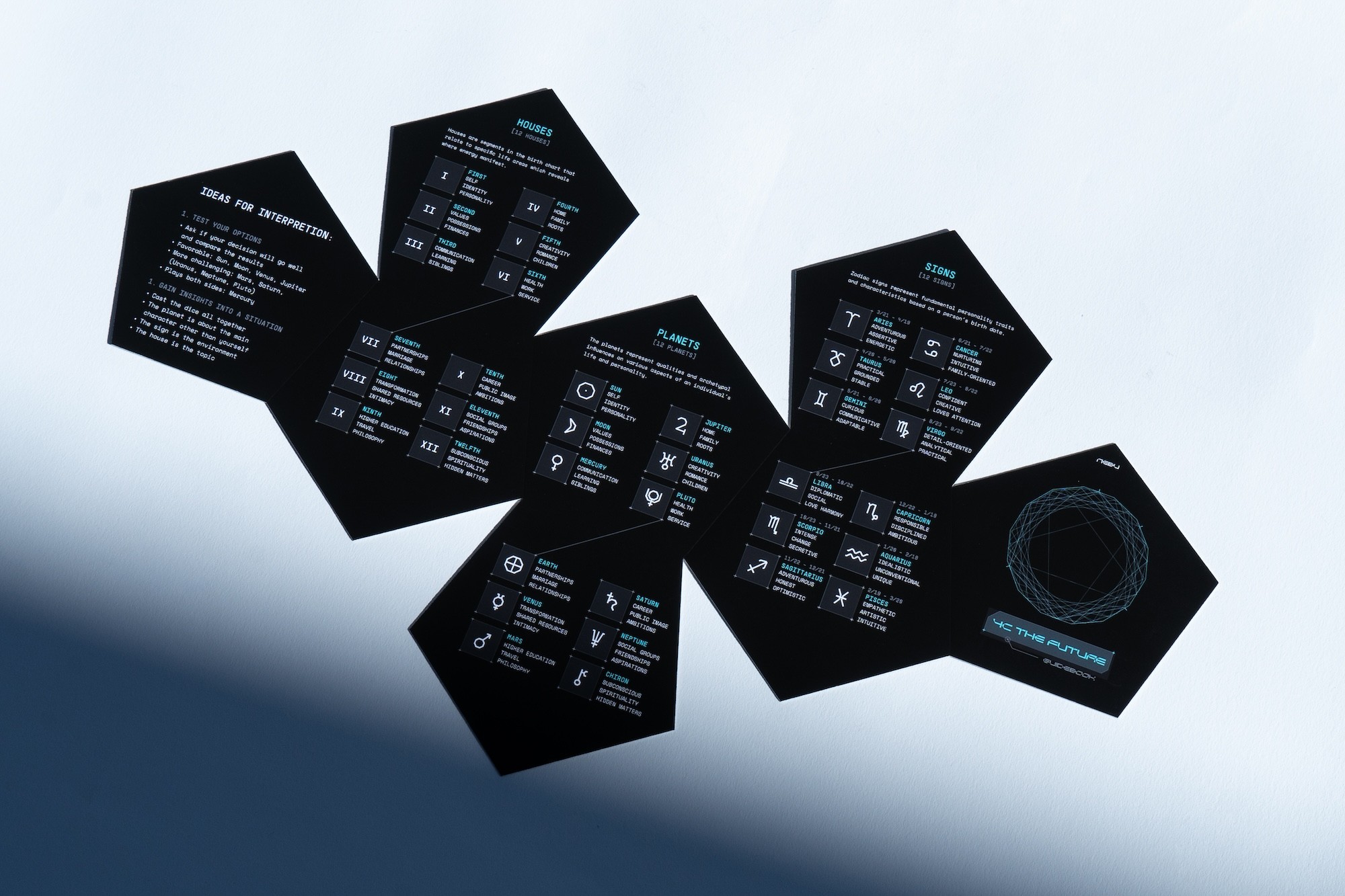 The logo draws inspiration from birth charts which are unique to all of us. The brand "nebu" came from the word Nebula which signifies the beginning of something magnificent just like the beginning of a person's journey into their promising future as they start to use our kit. The typeface used for the logo is "Ofform" which is modular and Retro-futuristic: a handshake between the traditional method of predicting the future and the modern world.