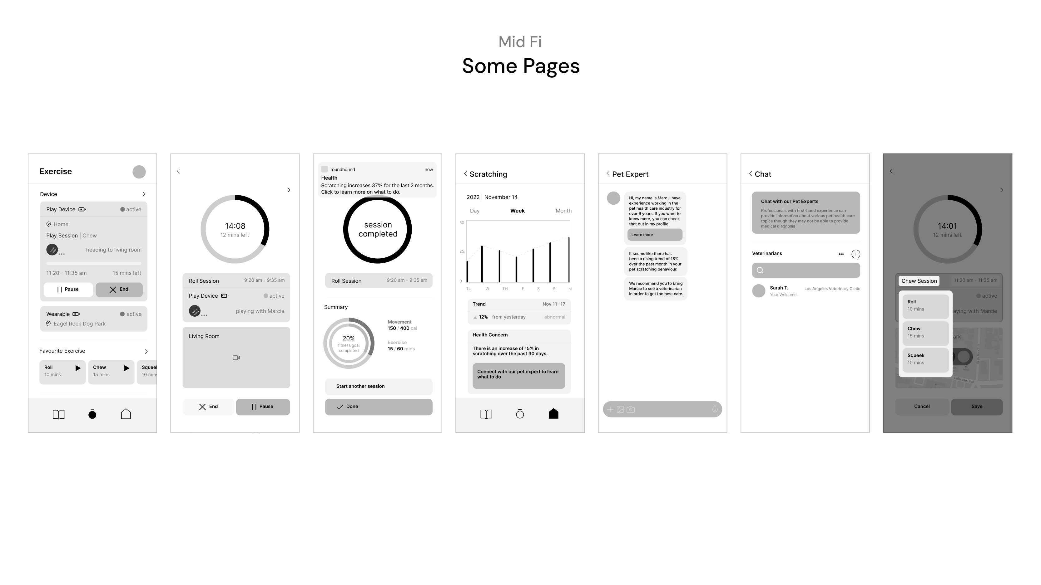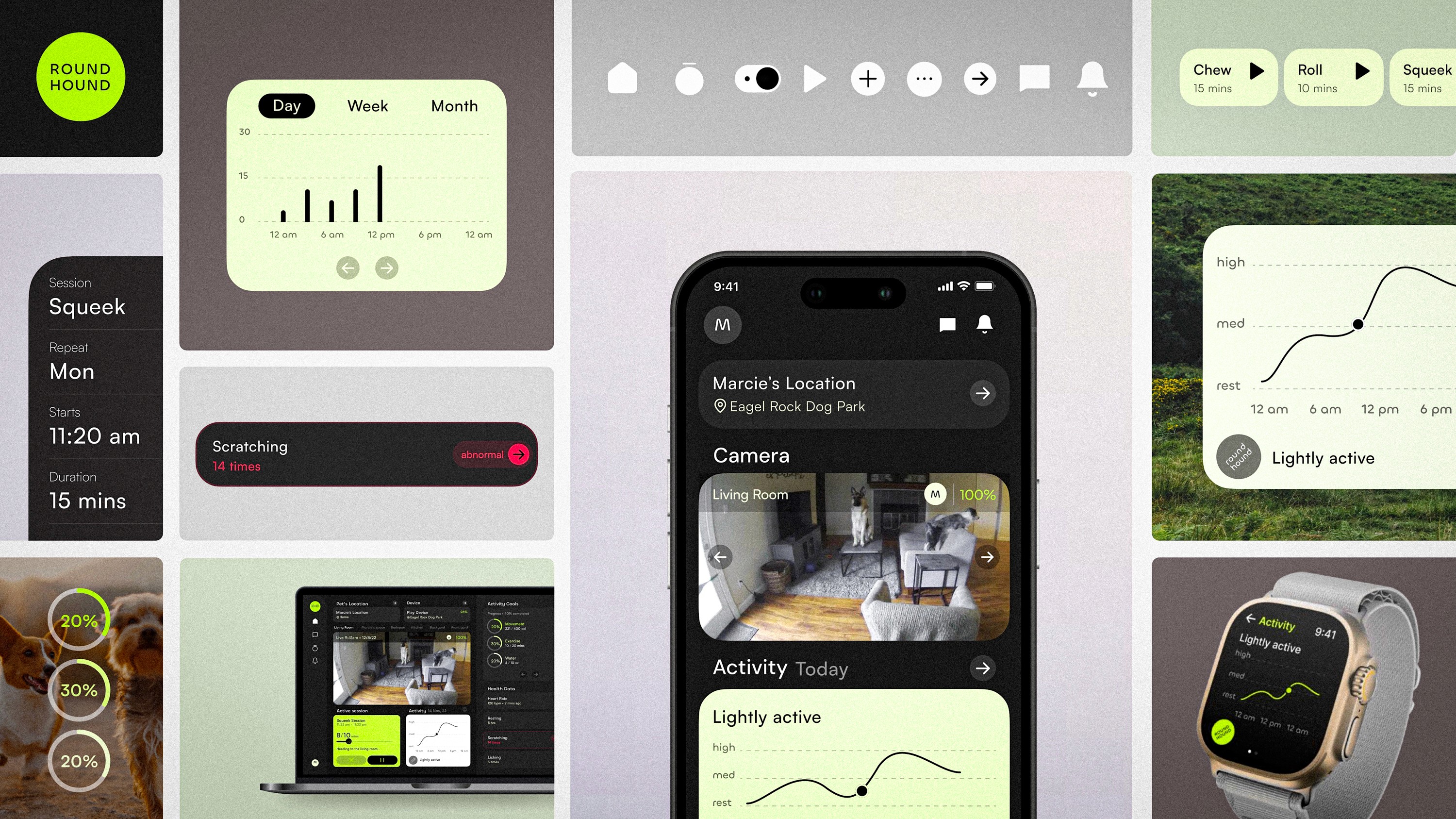 For design details, ROUNDHOUND uses rounded shapes—rounded rectangles, buttons, and iconography—to stay visually consistent with the logo’s curved form. The ROUNDHOUND logo itself doubles as a playful element, used as a ball to represent different levels of pet activity, reinforcing the brand’s cohesive, well-rounded theme.